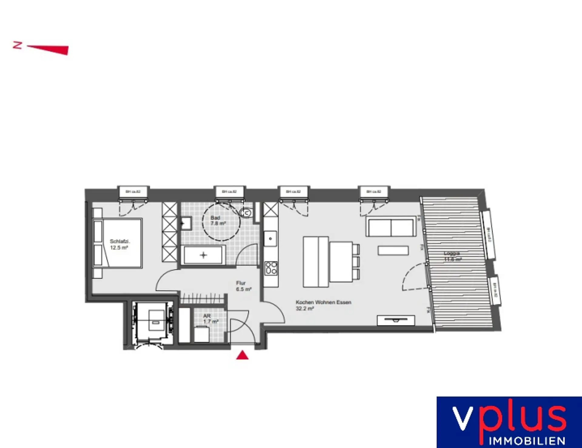 Die Wohnung verfügt über einen hellen Wohnraum mit einer voll ausgestatteten und hochwertigen Küche, einem Schlafzimmer, einem